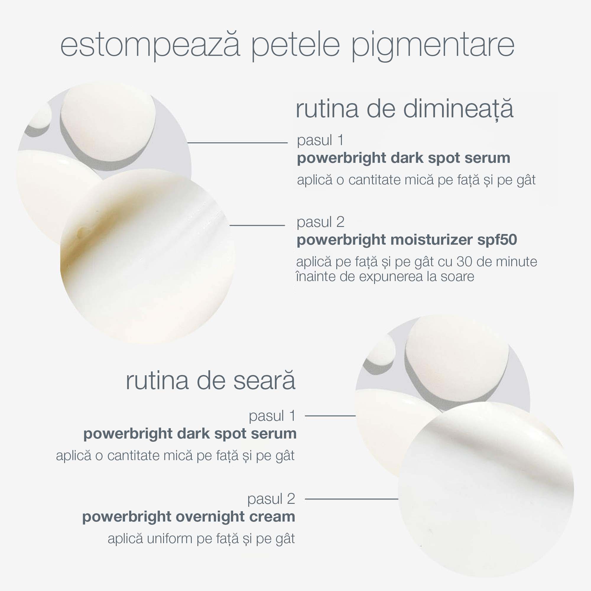 Kitul conține: PowerBright Dark Spot Serum 10ml, PowerBright Moisturizer SPF 50 12ml, și PowerBright Overnight Cream 15ml.