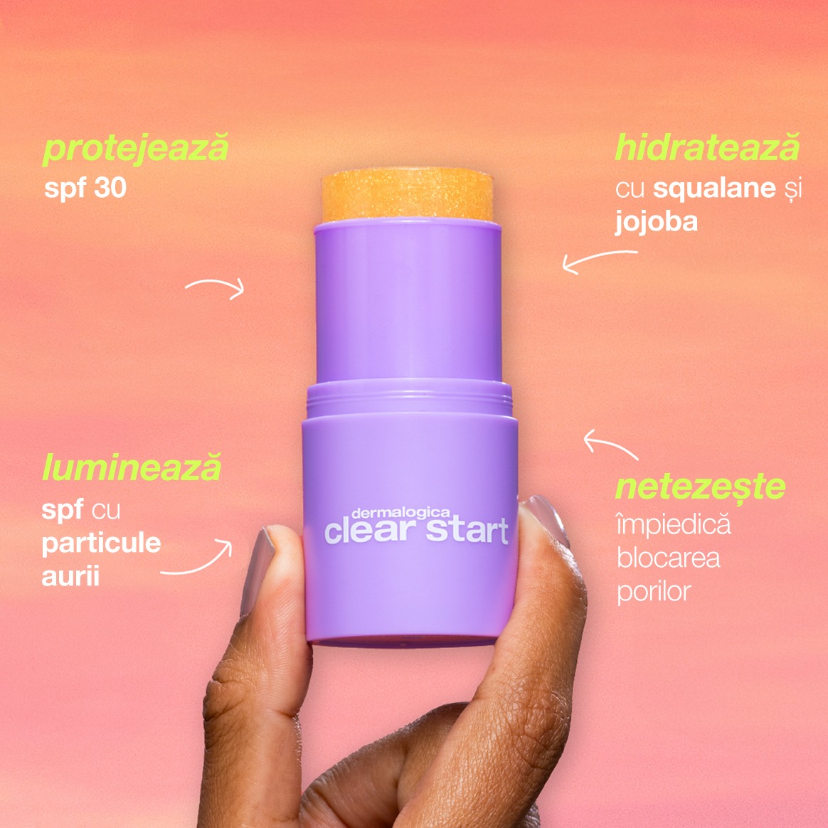 Fiecare oră este „Golden Hour” cu stick-ul hidratant cu SPF Clear Start. Protejează cu SPF30; curăță cu extract de scoarță de salcie, o formă naturală de acid salicilic; hidratează cu squalen și ulei din semințe de jojoba; și oferă un luciu auriu potrivit pentru toate tonurile de piele. Formula non-comedogenică nu îți va bloca porii. Pune-l în geantă pentru un plus de strălucire oriunde mergi! Poate fi folosit pe față și corp. Se aplică ușor pe piele și este perfect atât sub, cât și peste machiaj.