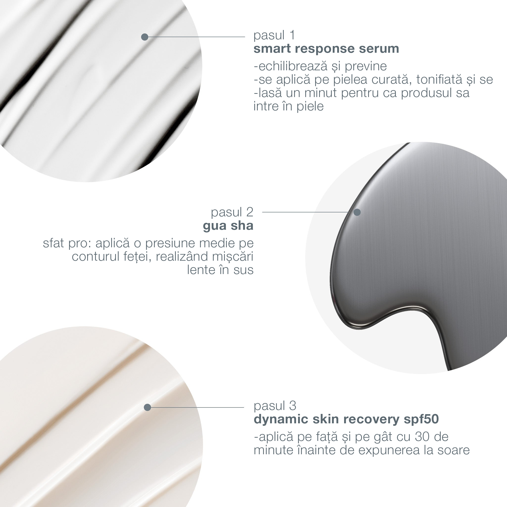 Aplică Smart Response Serum în fiecare dimineață și seară, după curățare și tonifiere. Așteaptă un minut ca produsul să se absoarbă în piele. După aplicarea Smart Response Serum, folosește Gua Sha pentru a aplica o presiune medie pe conturul feței, mișcându-te cu mișcări lente în sus. Aplică o cantitate generoasă de Dynamic Skin Recovery SPF50 pe față și gât, de preferință cu 30 de minute înainte de expunerea la soare.